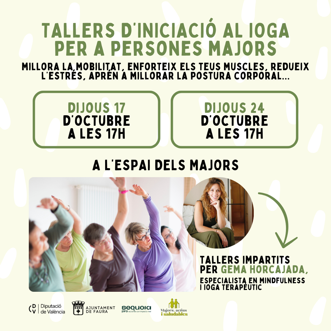 L'Espai dels Majors de Faura (C/N'Avelina Taberner) acollirà els dies 17 i 24 d'octubre, a les 17 hores, dos tallers gratuïts d'iniciació al ioga per a persones majors dins del seu programa "Majors actius i saludables", finançat per la Diputació de València.