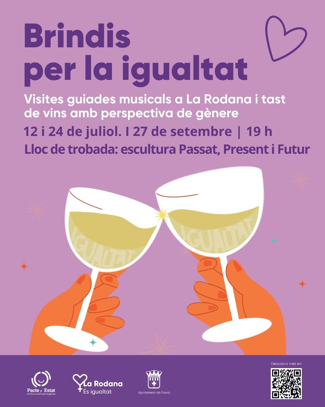 L’Ajuntament de Faura presenta “Brindis per la igualtat”, una iniciativa emmarcada dins del Pacte d’Estat contra la Violència de Gènere que proposa tres passejades guiades per La Rodana els dies 12 i 24 de juliol i 27 de setembre, a les 19:30 h, amb eixida des de l’escultura “Passat, Present i Futur”.