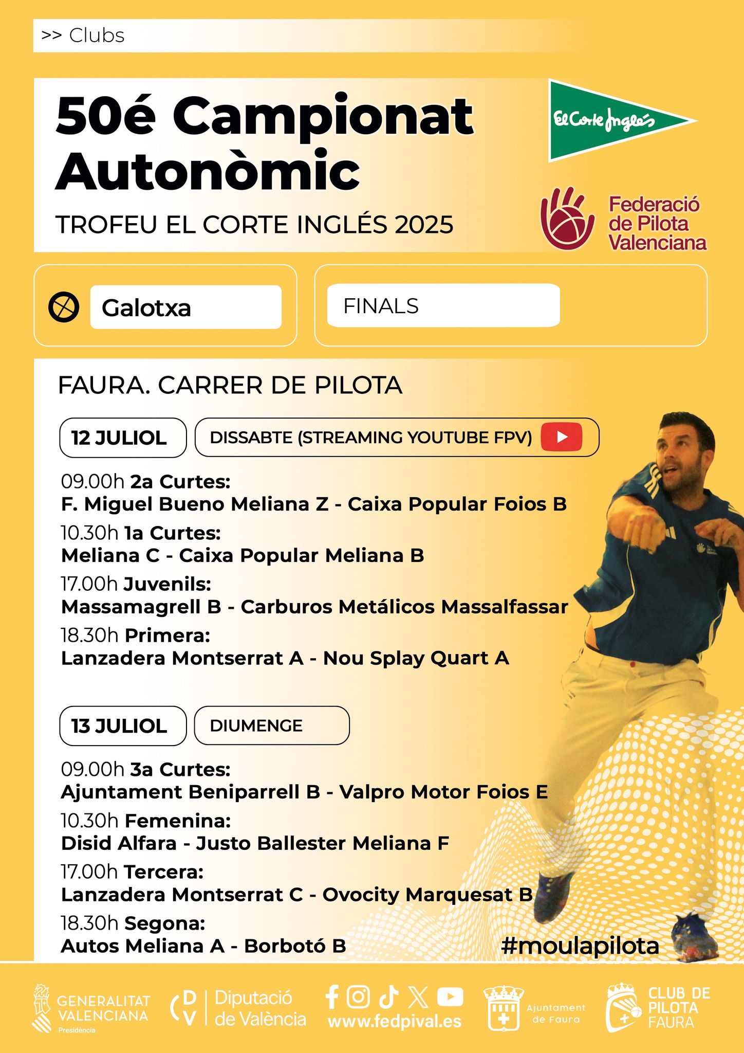 Este dissabte i diumenge vine a gaudir del millor espectacle de pilota valenciana, amb partides de totes les categories: juvenils, femenina, tercera, segona, primera… i molt més! Amb streaming en directe a YouTube FPV el dissabte!