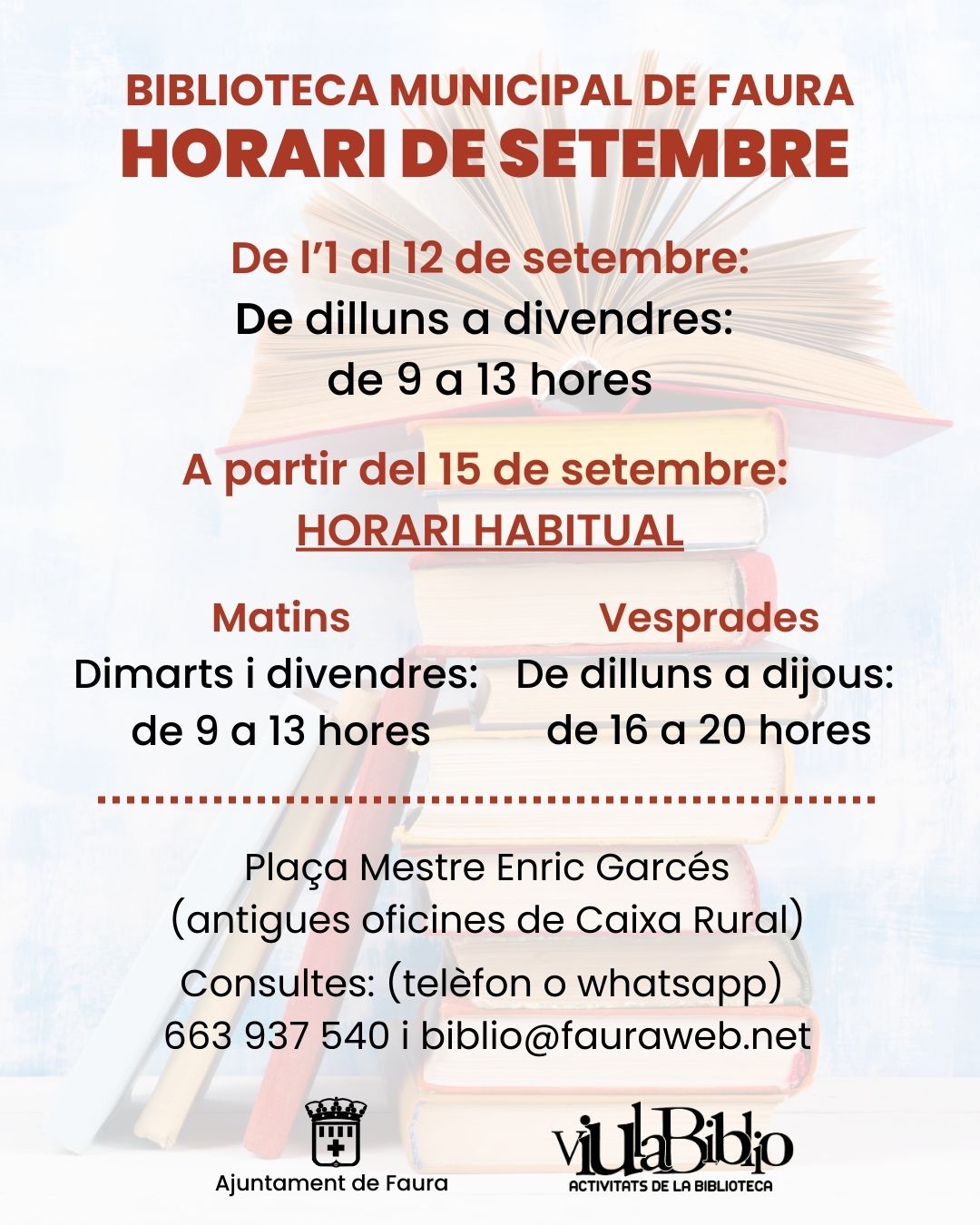 A partir del 15 de setembre: horari habitual. Matins: dimarts i divendres, de 9 a 13 hores. Vesprades: de dilluns a dijous, de 16 a 20 hores.