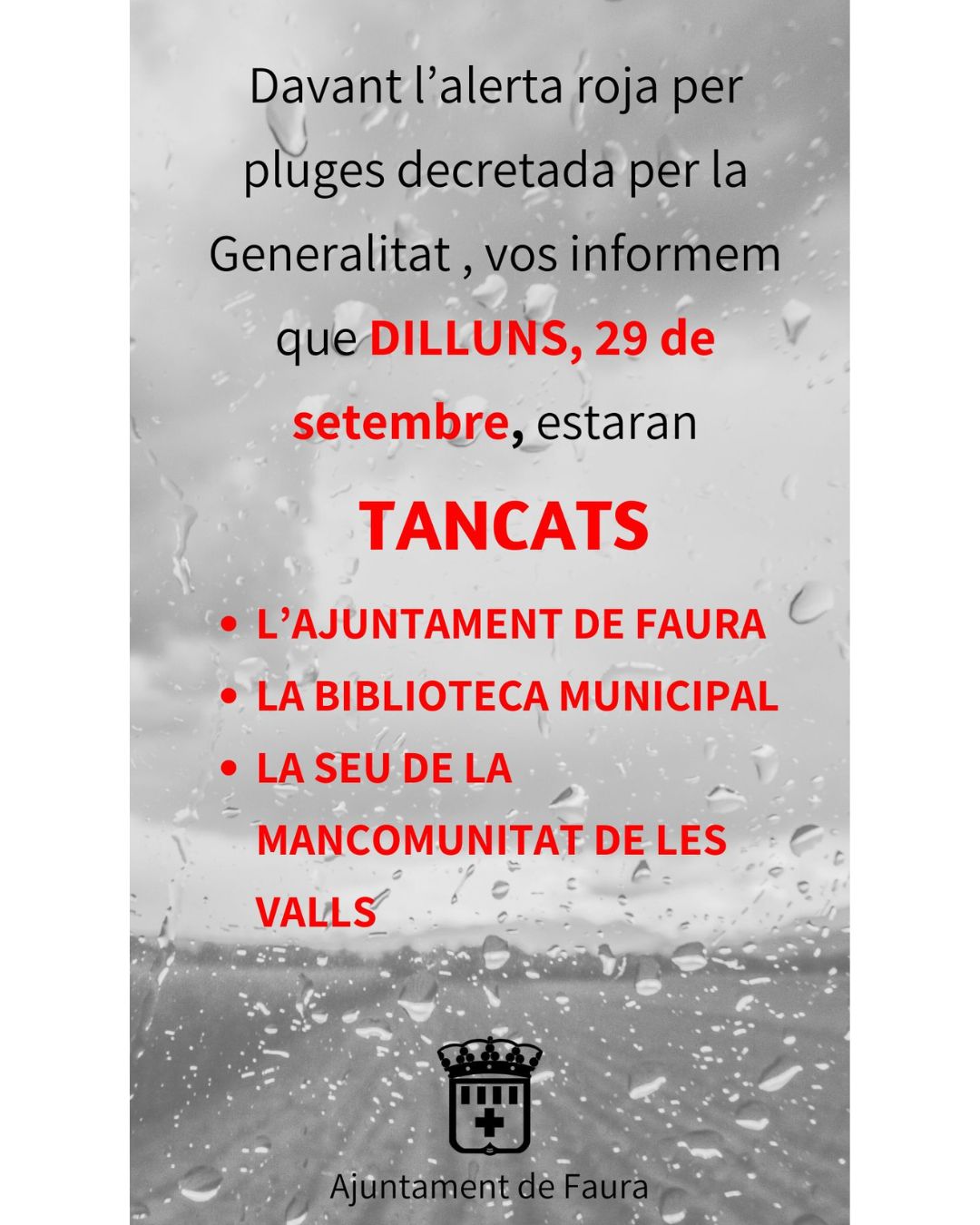 Davant l’alerta roja per pluges decretada per la Generalitat , vos informem que DILLUNS, 29 de setembre, estaran TANCATS: