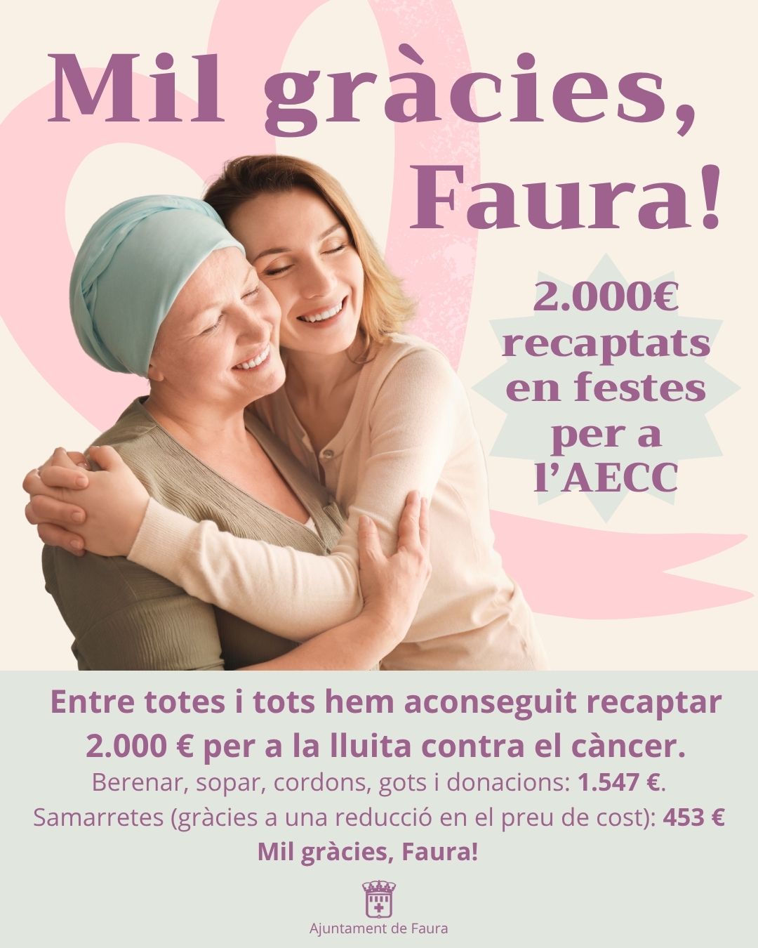 Gràcies, gràcies i mil gràcies! Entre totes i tots hem aconseguit recaptar durant les Festes d'Agost 2.000 € per a la lluita contra el càncer.